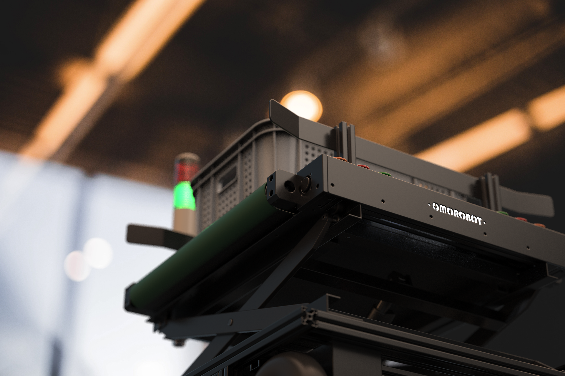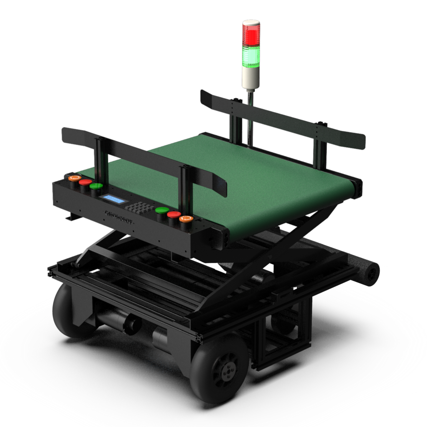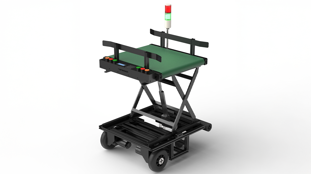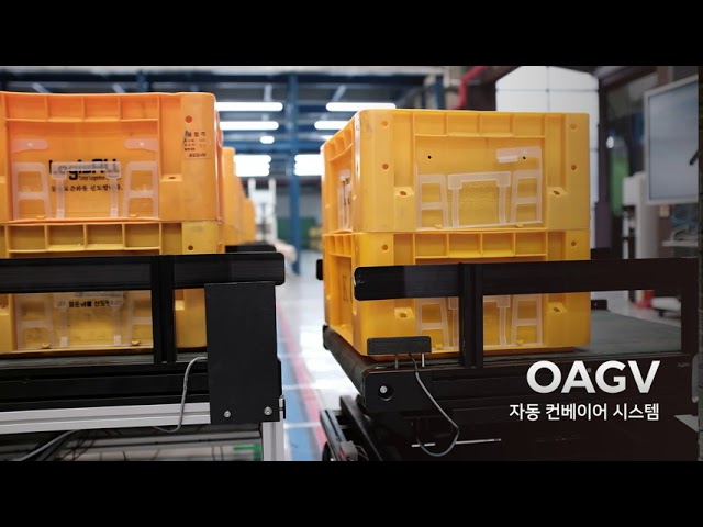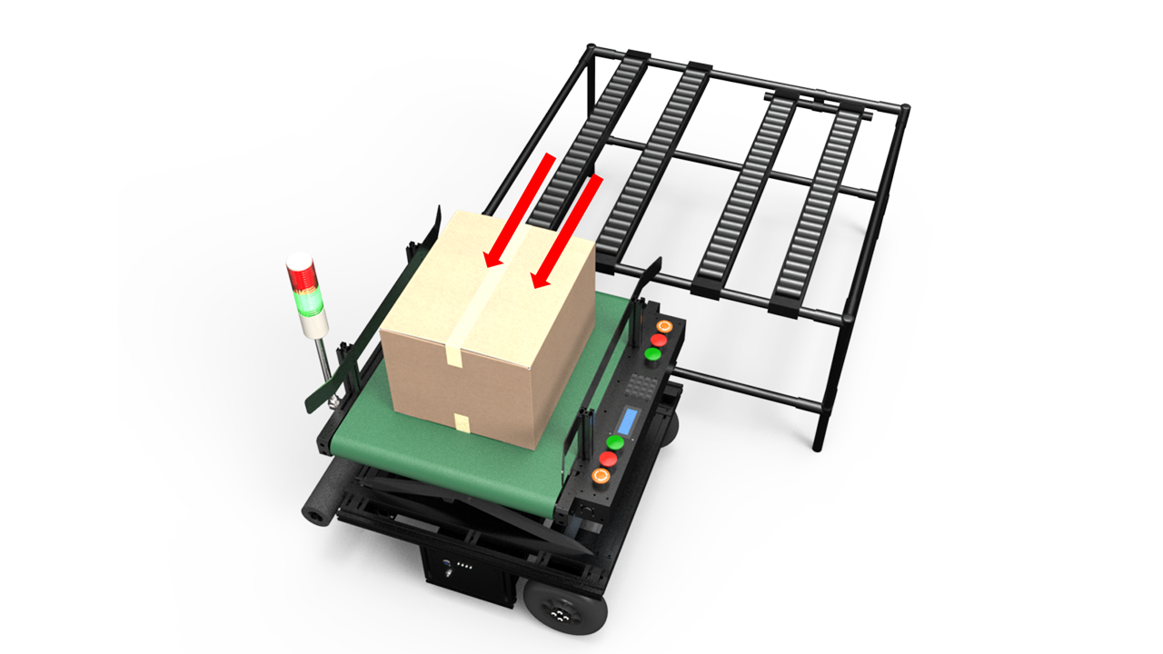 指定された位置で自動停止し、AGVがコンベヤを作動させて