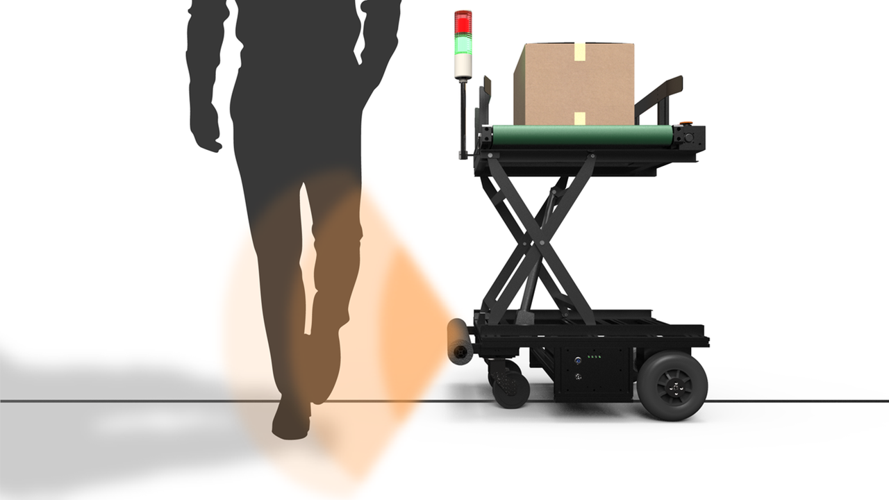 走行中に障害物を検知すると、自動的に減速・停止して事故を防止します。前面には衝撃を吸収するバンパー構造を採用し、