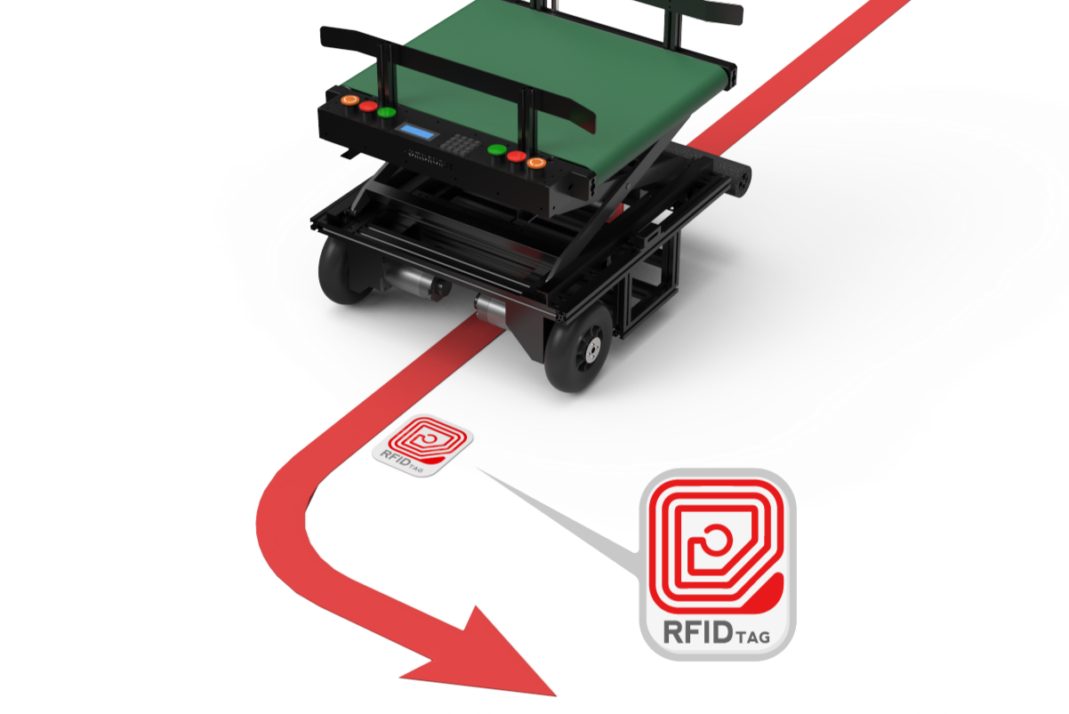 床面に設置したRF-TAGを介して環境に合わせた指令を受け取り、停止・回転などさまざまな動作を実行します。